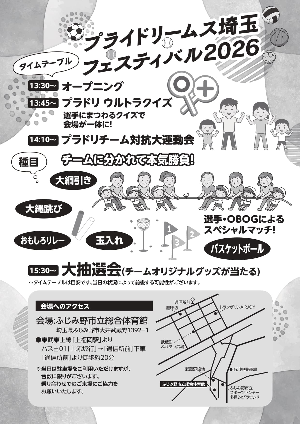 プライドリームス埼玉では、ふじみ野市立総合体育館にて「プライドリームス埼玉フェスティバル2026」を開催いたします。
